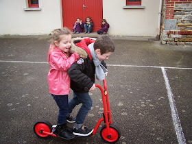 En janvier, Juku et Juula sont arrivés en France. Nous étions très contents et grâce à eux nous avons parlé de la confiance. Avec les vélos, nous avons testé la confiance. Quand je suis avec un ami sur un vélo, je lui fais confiance. Même chose avec une trottinette. Quand je vais très vite avec mon vélo, ou ma trottinette, j'ai confiance en moi. Quand je réalise un parcours de motricité avec un vélo ou une trottinette, j'ai confiance en moi, je vais réussir. Ce fut une très belle expérience.
